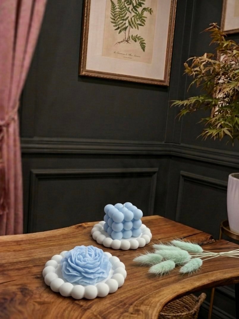 Sky Blue Bubble Candle & Tray Set – Geometric Cube & Floral Rose