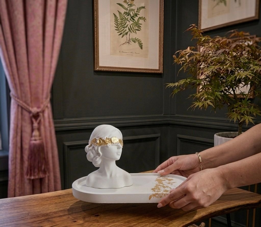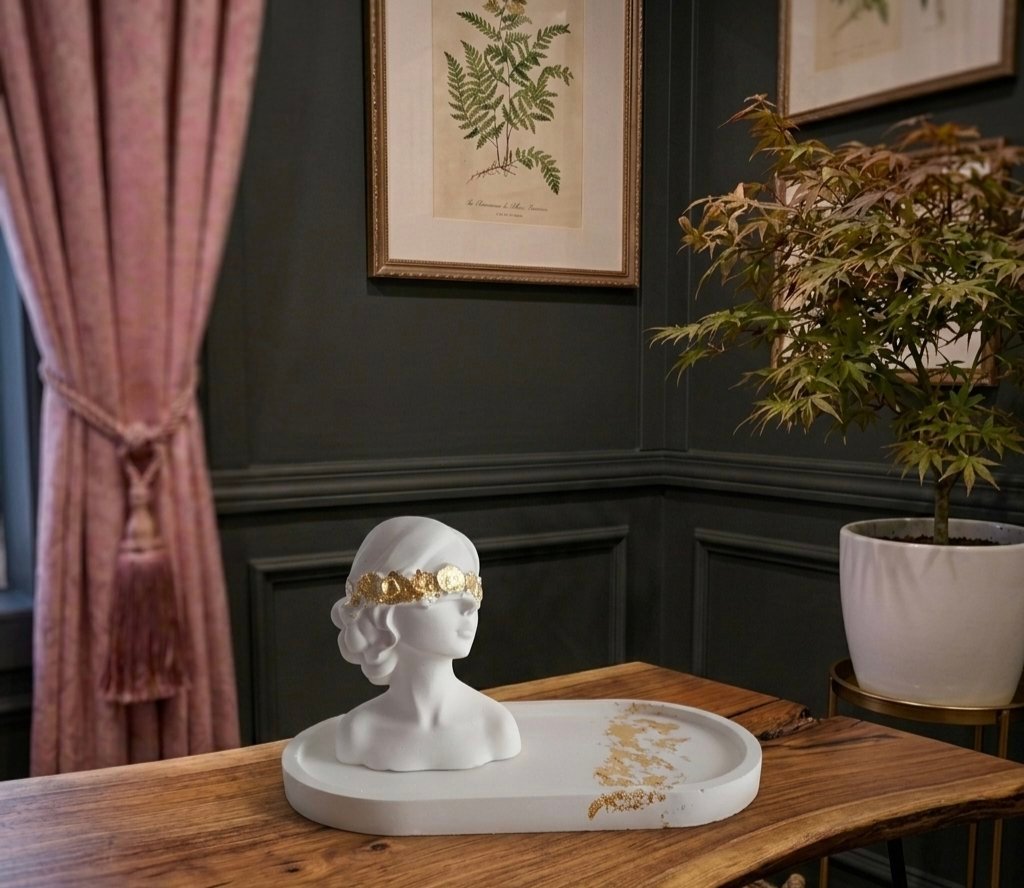 The “Gilded Venus” set is a statement of sophisticated eccentricity. Curated exclusively by Hearttouching.pk, this 2-piece collection reimagines classical Greek aesthetics through a modern, custom lens. The focal point is a beautifully crafted matte white lady’s bust, featuring a hand-applied, textured gold foil blindfold/detail over her eyes. Paired with a matching gold-flecked tray, this set offers a complete, curated display for a high-end vanity, executive desk, or statement console.
