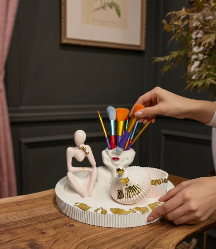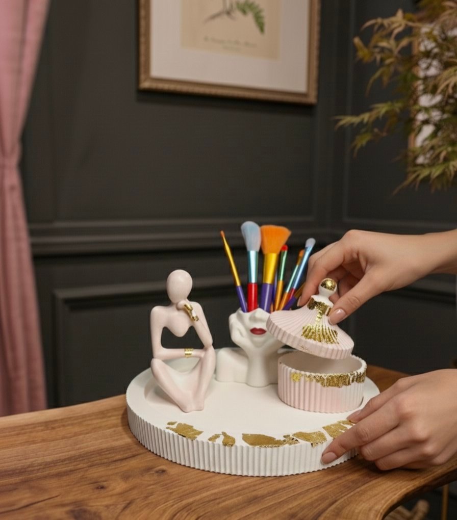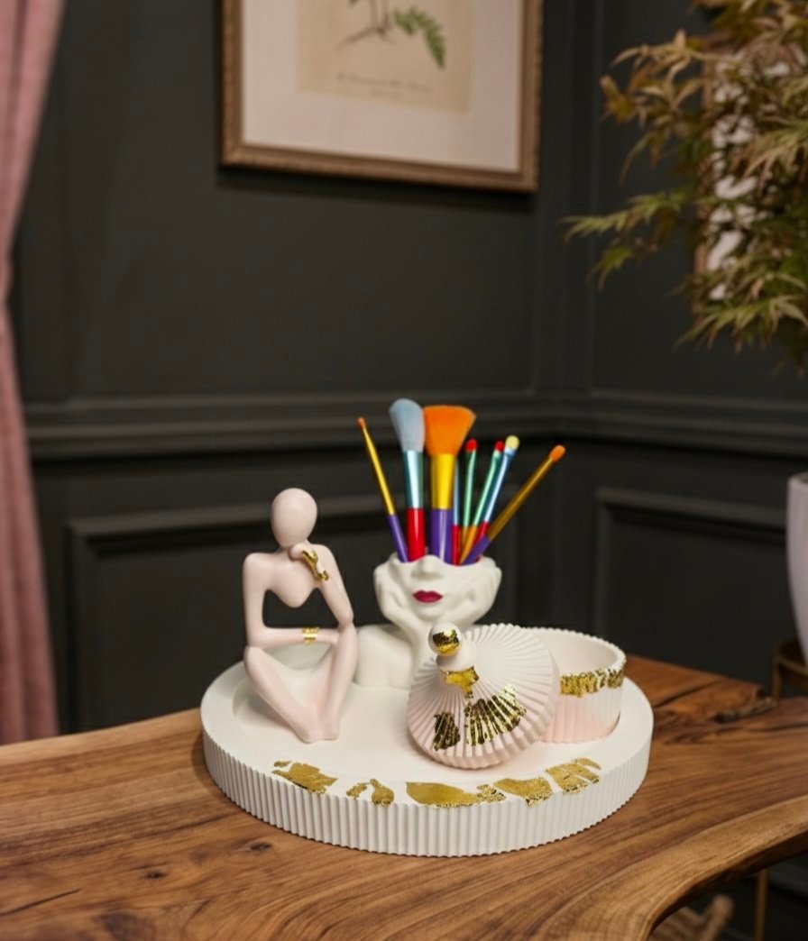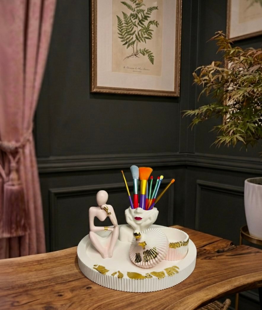 Give your vanity or office desk a sophisticated makeover with our Face Brush Holder & Sculpture Set. Exclusively by Hearttouching.pk, this collection is a perfect mix of abstract art and daily organization.