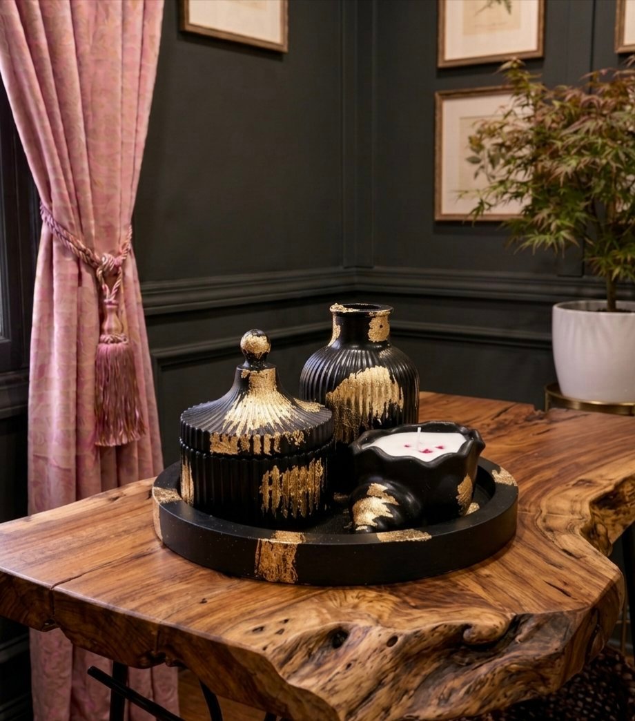 Whether placed on a coffee table, a vanity, or an office desk, this set serves as a sophisticated focal point that radiates elegance and warmth.