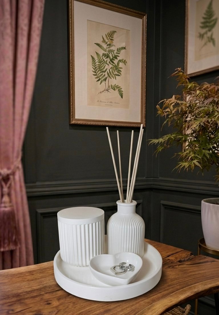1 x Ribbed Vase: A contemporary vessel with vertical textures for botanical or diffuser displays.